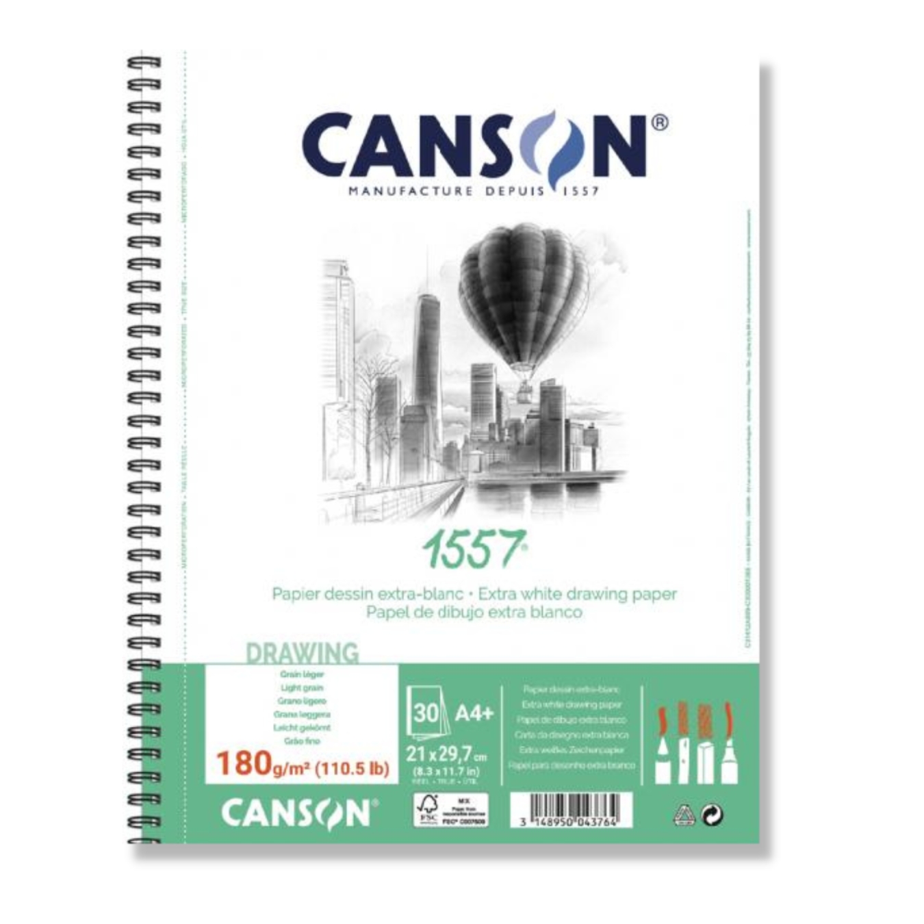 Canson 1557 teken- en schetspapier spiraal blok – fijne korrel – 180 grams – 30 vellen – A4