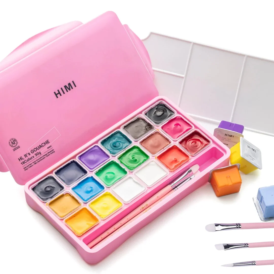HIMI Gouache – set van 18 kleuren x 30gr – in kunststof opbergbox roze + 3 penselen