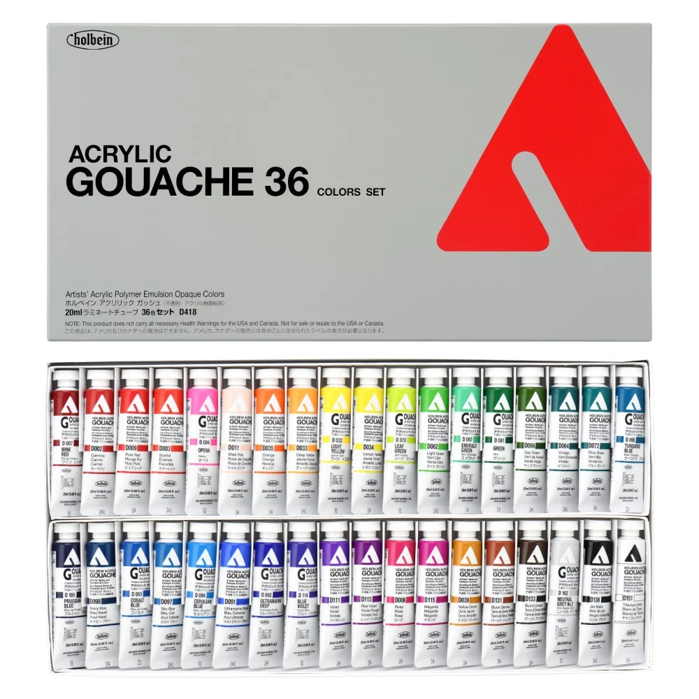Deze set bevat 18 kleuren Holbein Acrylic Gouache in tubes van 20ml.