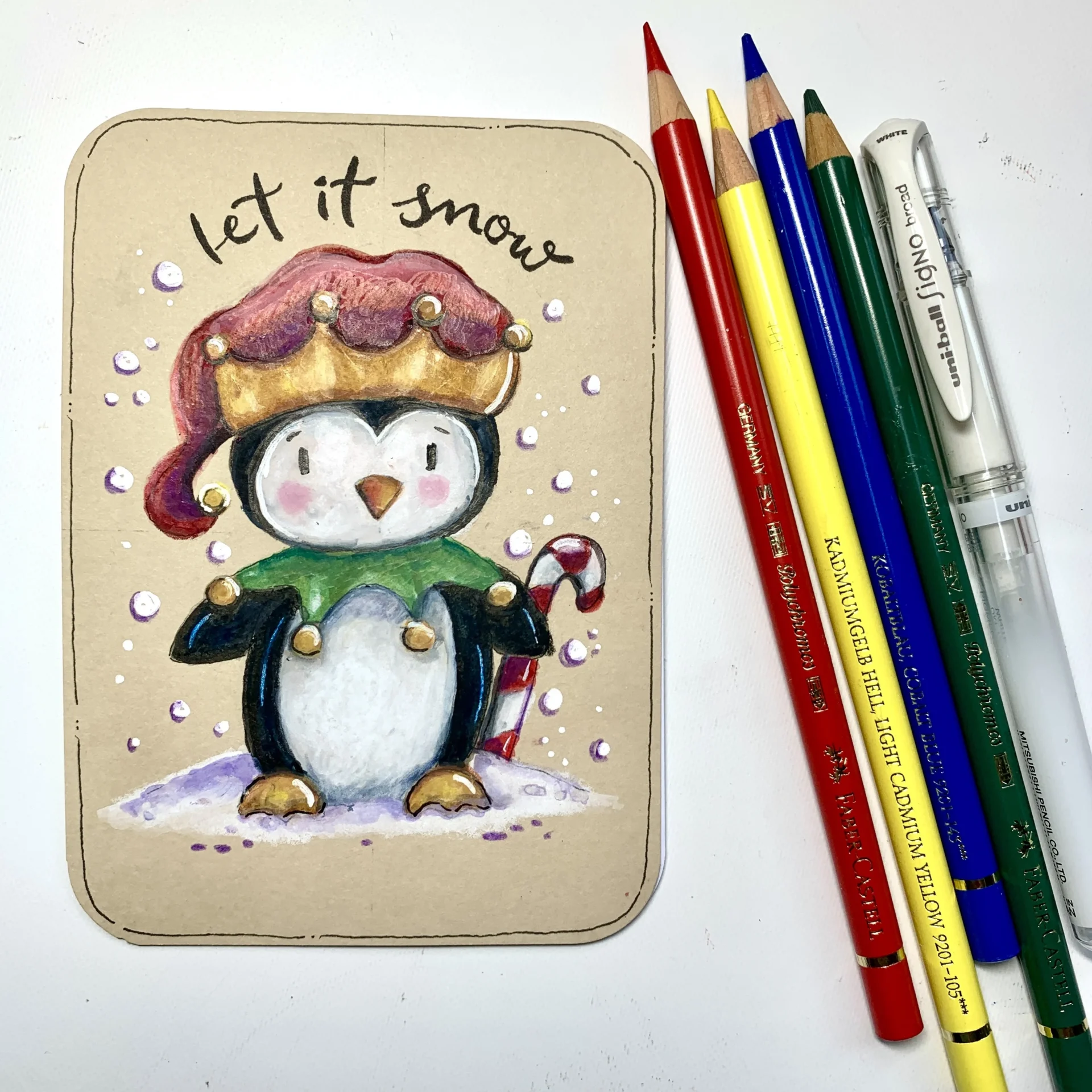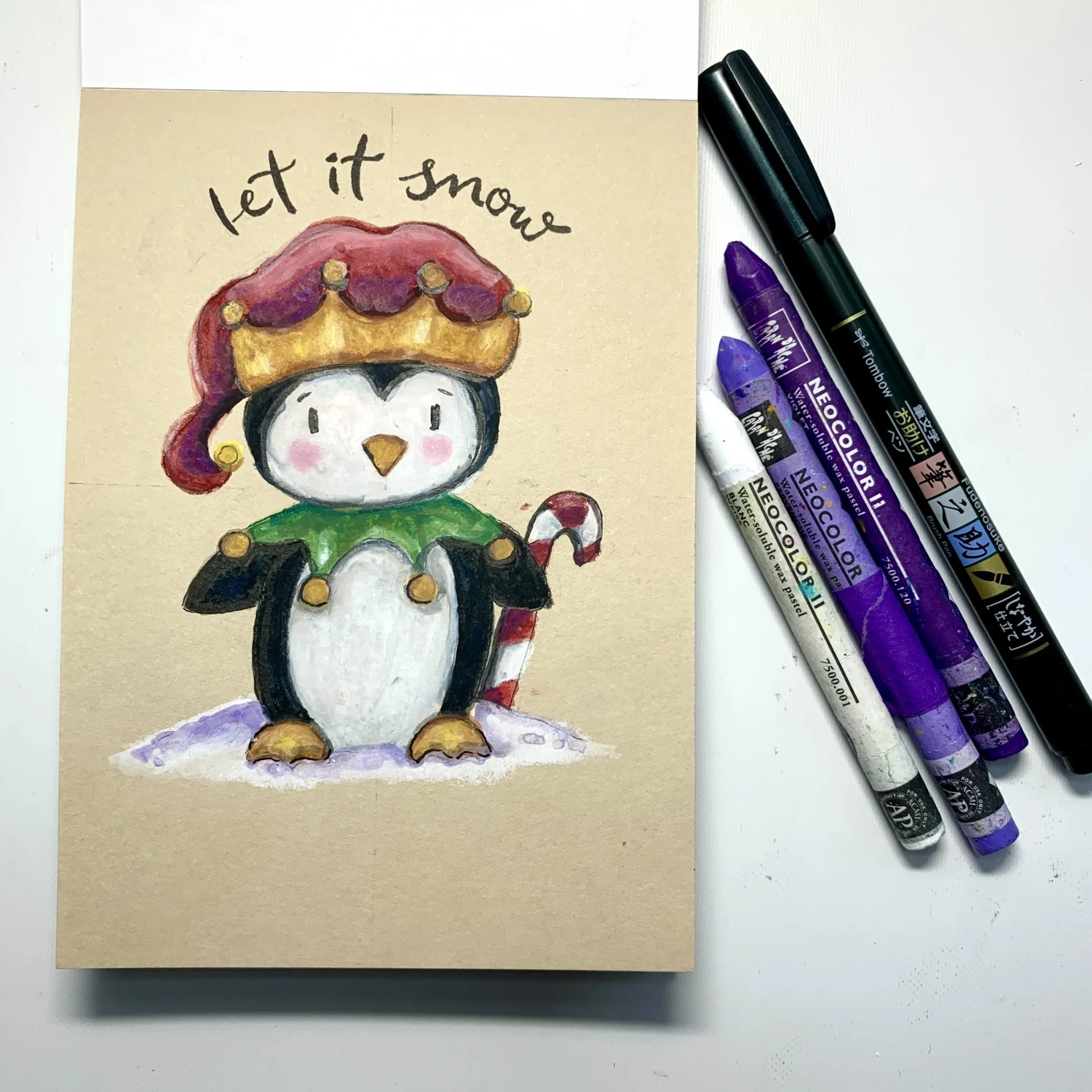 Met dit stappenplan laat ik zien hoe je dit Let it Snow pinguinkaartje kunt maken en hoe je zo’n tekening kunt opbouwen. Teken je mee?